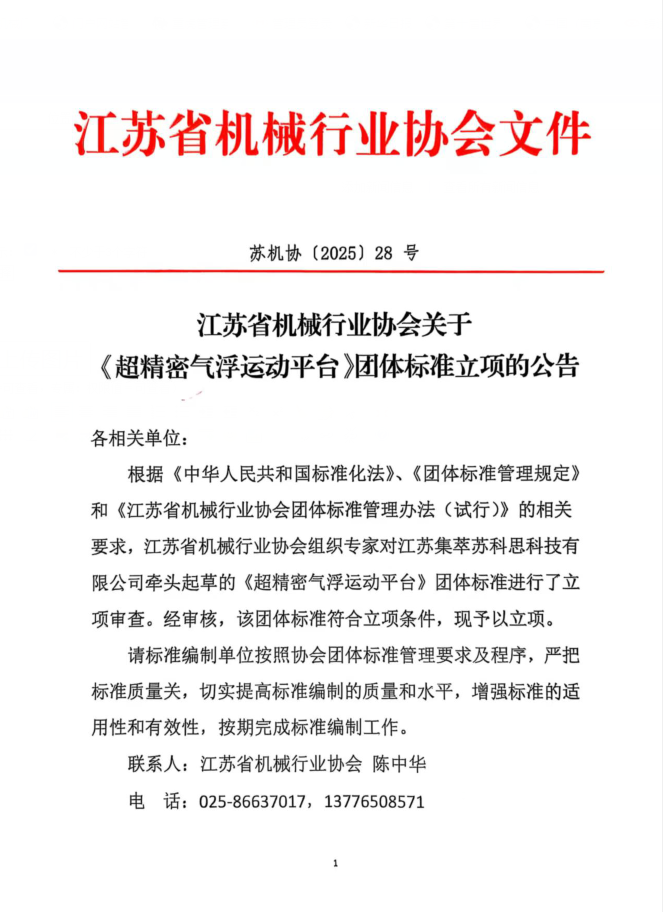 江苏省机械行业协会关于《超精密气浮运动平台》团体标准立项的公告