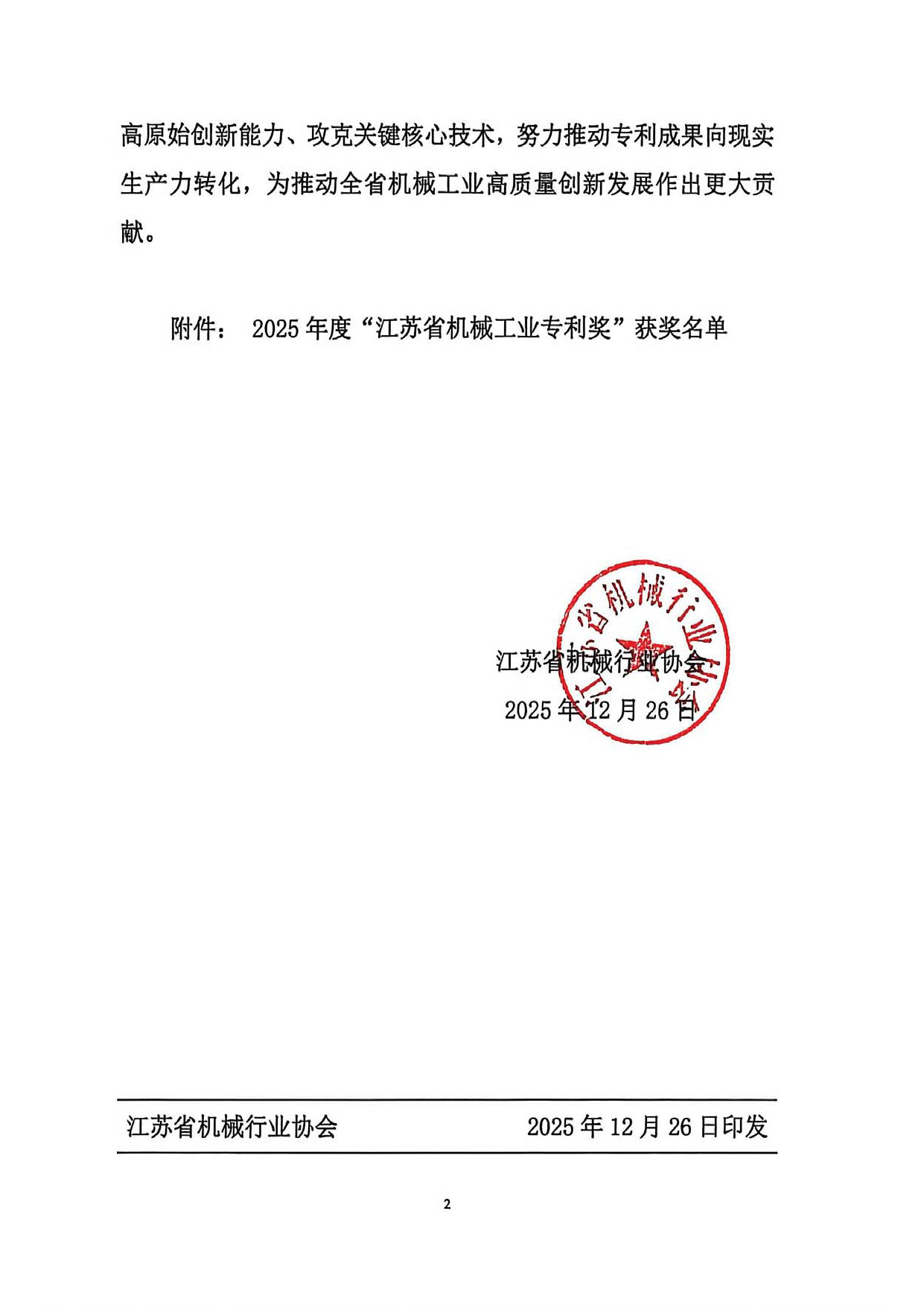 关于表彰2025年度“江苏省机械工业专利奖”的决定