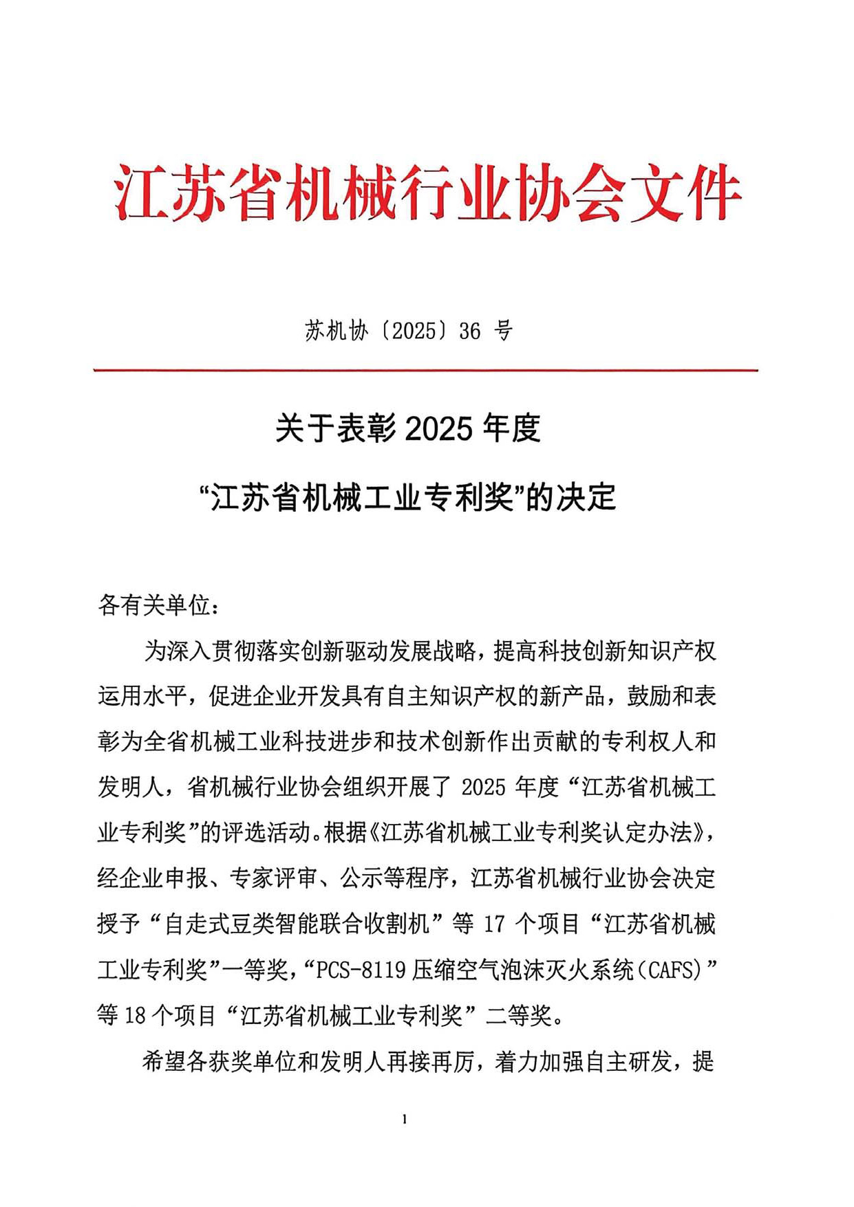关于表彰2025年度江苏省机械行业“创新产品、创新装备”的决定